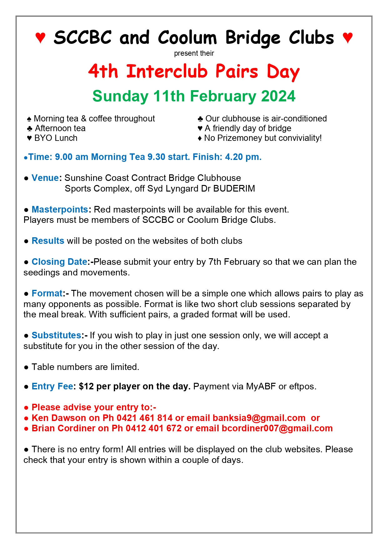 A one-day Matchpoint Pairs event for members of Sunshine Coast Bridge Club and Coolum Bridge Club.