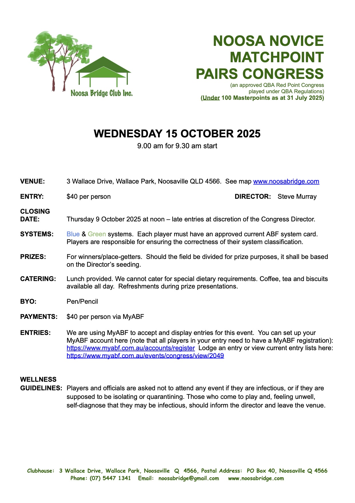 Noosa Novice Matchpoint Pairs Congress | 40 credits | Wednesday | 15-10-2025 - 9am | 34 | Enter View Entries |