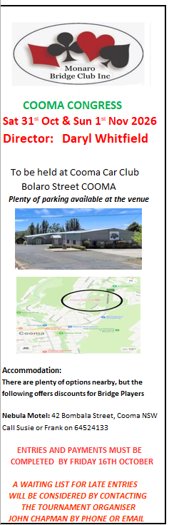 | Pairs | 70 credits | Saturday | 31-10-2026 - 10am | 2 | Enter View Entries |