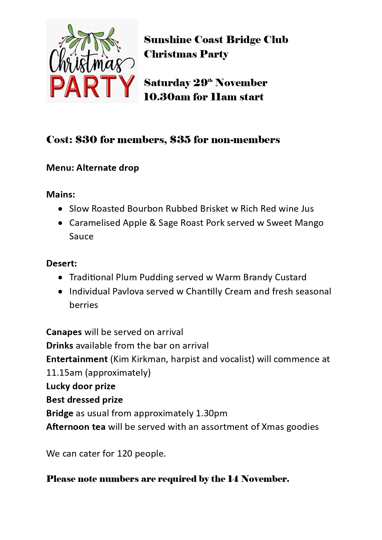 | SCBC Christmas Party | 30 credits | Saturday | 29-11-2025 - 10:30am | 32 | Enter View Entries |