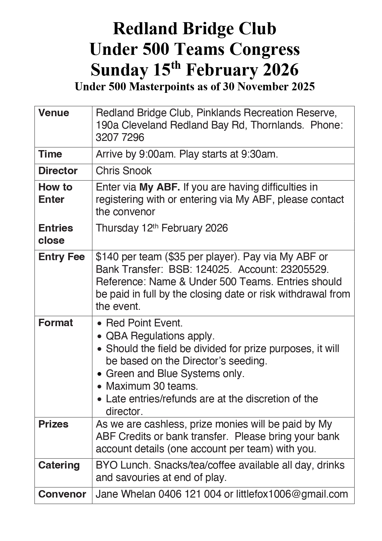 | Redland Under 500 Teams | 35 credits* | Sunday | 15-02-2026 - 9:30am | 0 | Entries open in 3 daysView Entries |
