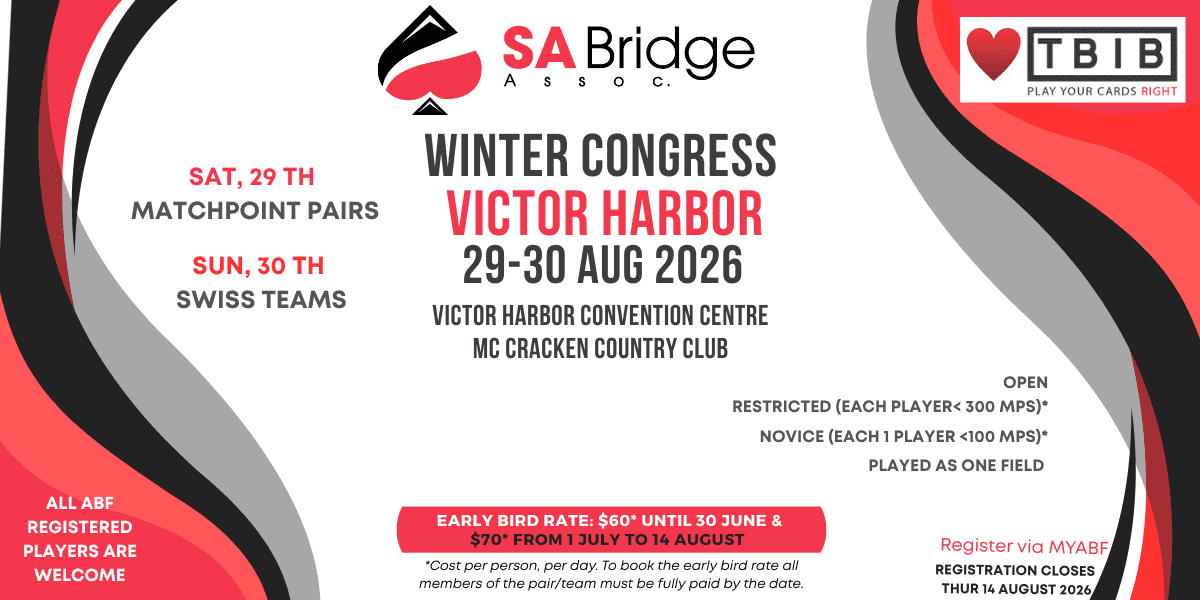 The South Australian Bridge Association Winter Congress will be held over 2 days, 29th & 30th August 2026 at the Victor Harbor Convention Centre.