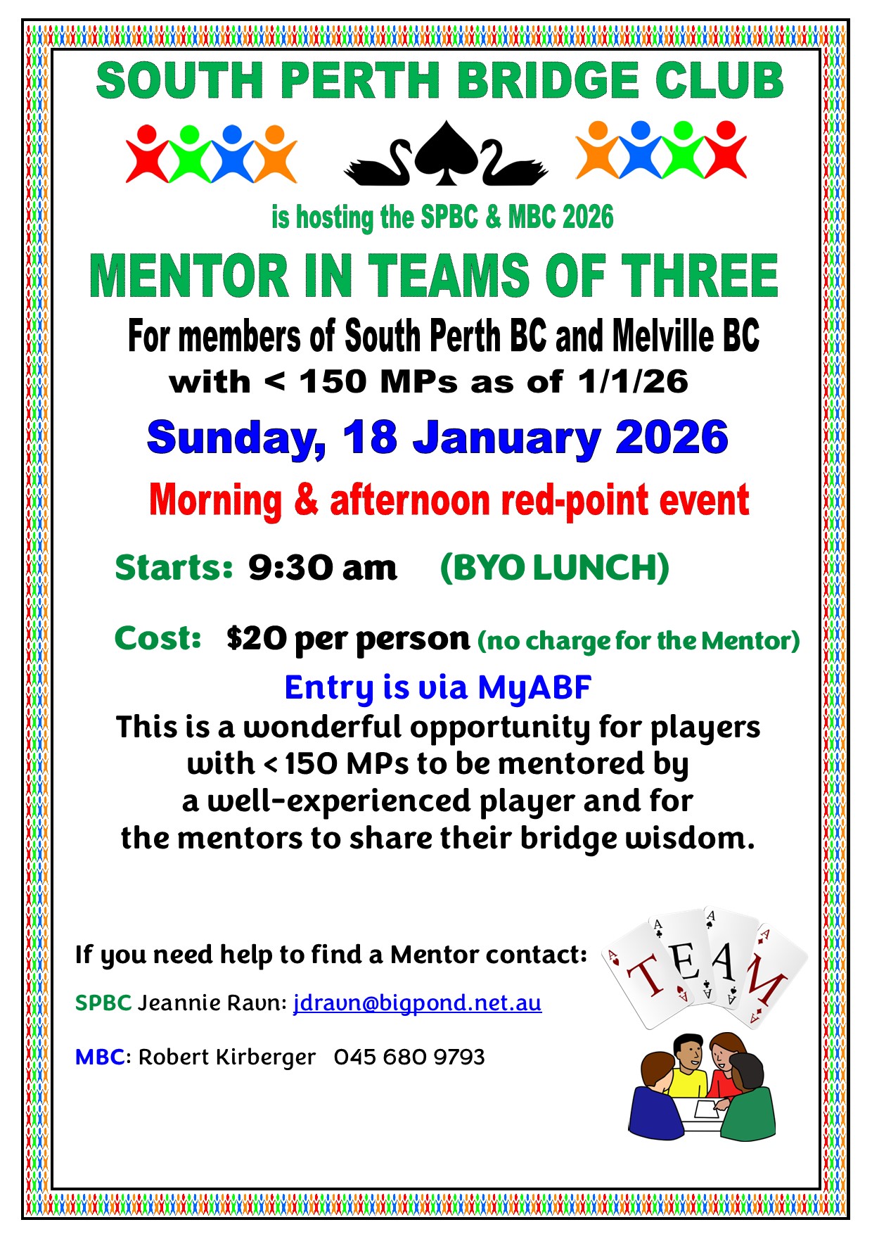 This is a wonderful opportunity for players with <150 MPs to be mentored by a well experience player and for the mentors to share their bridge wisdom.