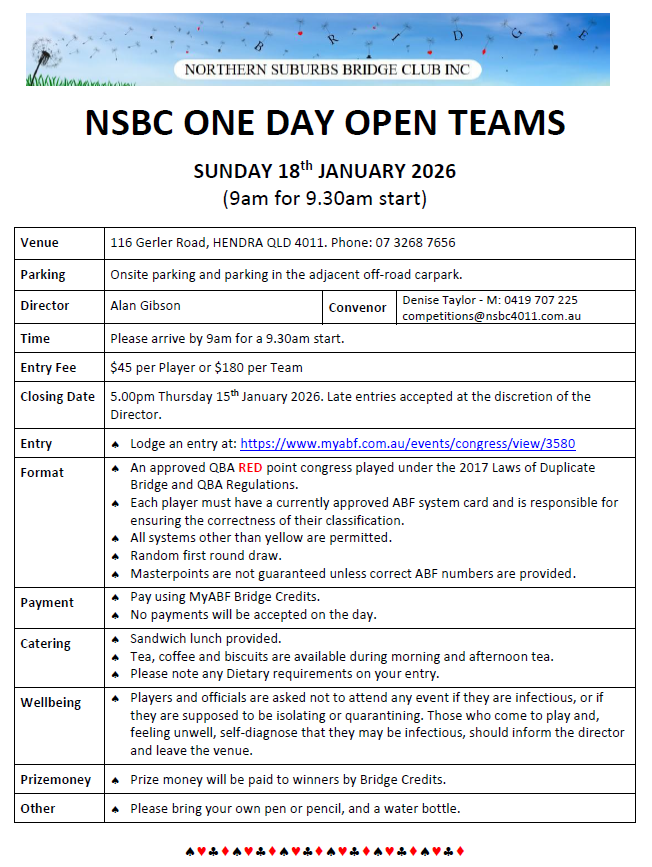 | NSBC One Day Open Teams | 45 credits* | Sunday | 18-01-2026 - 9:30am | 0 | Entries open in 9 daysView Entries |
