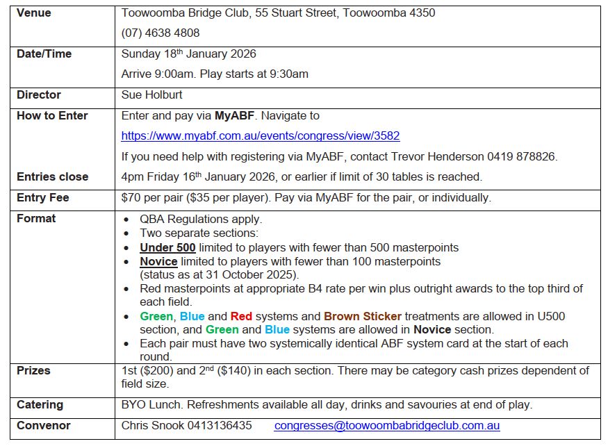 | Email: congresses@toowoombabridgeclub.com.au | |