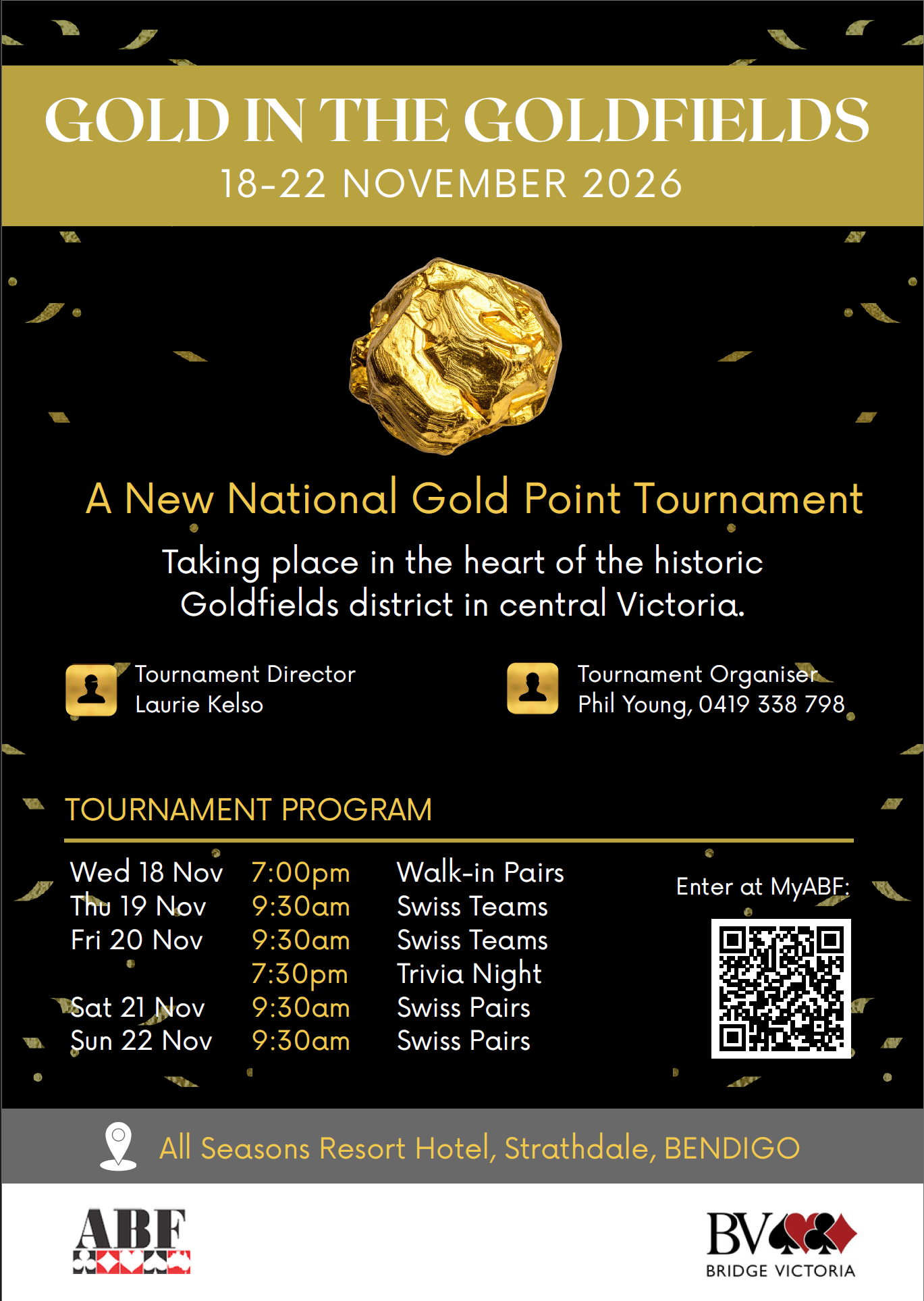 | Goldfields Swiss Pairs | 192 credits | Saturday | 21-11-2026 - 9:30am | 5 | Enter View Entries |