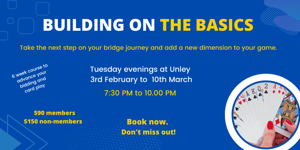 Pre-requisite knowledge – Participants are expected to have a sound understanding of the basics, as covered in the beginners’ course (including opening and responsive bids, strong openings, 1NT responses – Stayman and transfers).