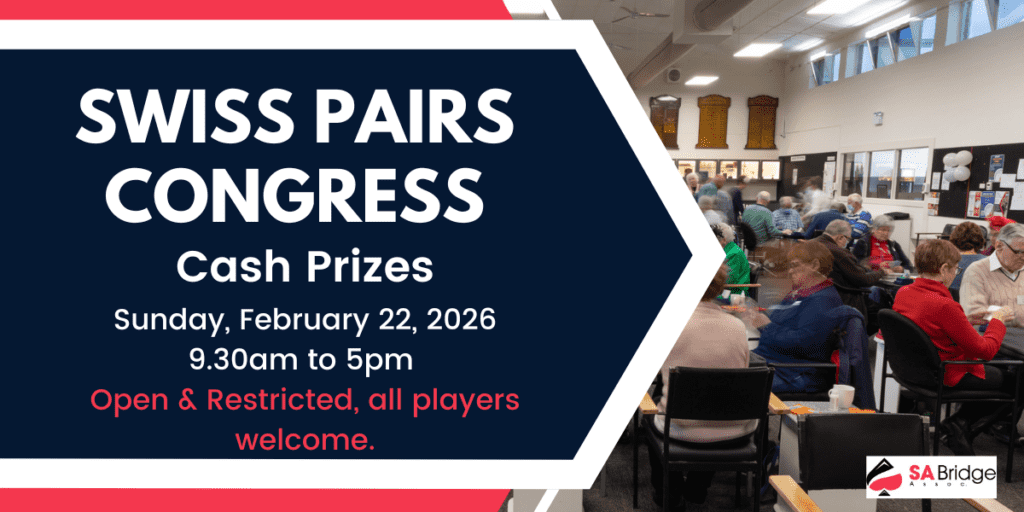 The SA Bridge Association Swiss Pairs Congress will be held on Sunday, February 23rd from 9:30 AM to 5:00 PM at Unley.