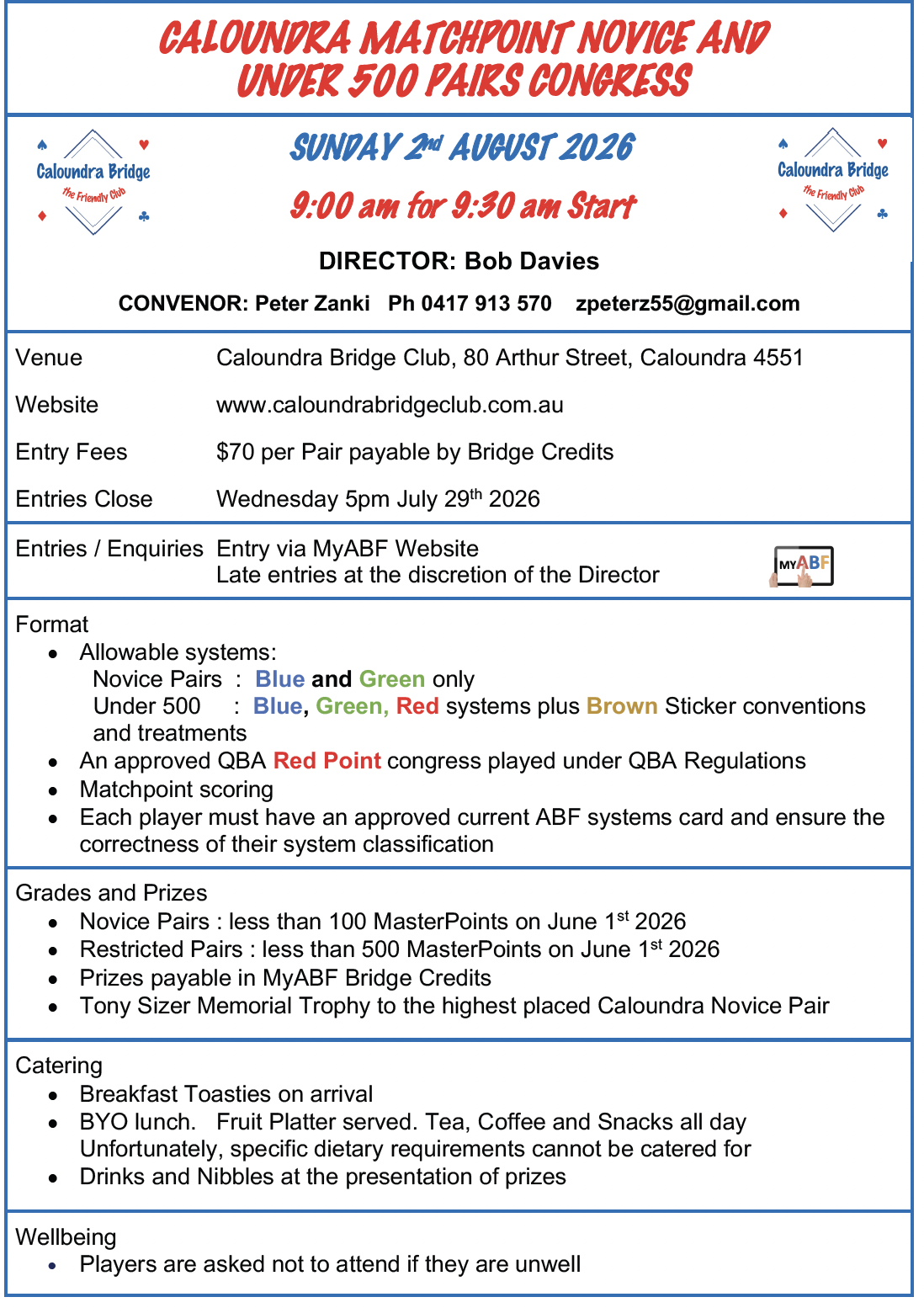 | Novice Under 100 MPs at June 1 2026 | 35 credits | Sunday | 02-08-2026 - 9:30am | 0 | Enter View Entries |
