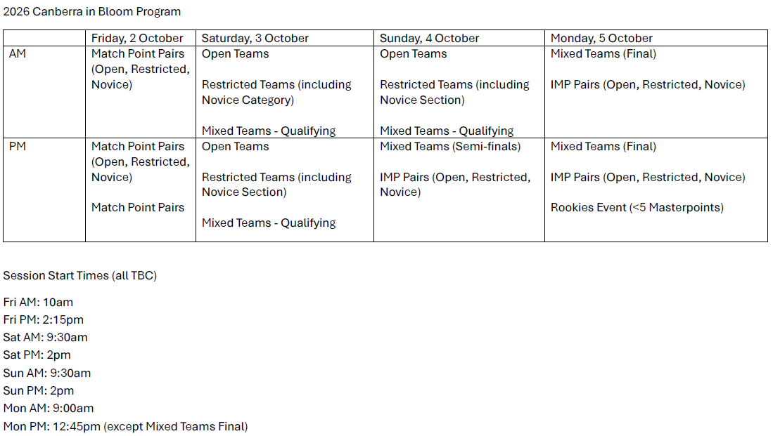 | Canberra Bells IMP Swiss Pairs | 115 credits | Sunday | 04-10-2026 - 2pm | 1 | Enter View Entries |