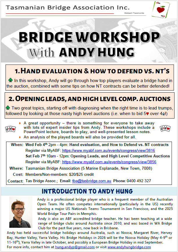 Andy Hung, one of Australia's leading players and teachers, will present a workshop at the TBA clubrooms from 10.00 am to noon on Saturday 7th February. No partner needed.