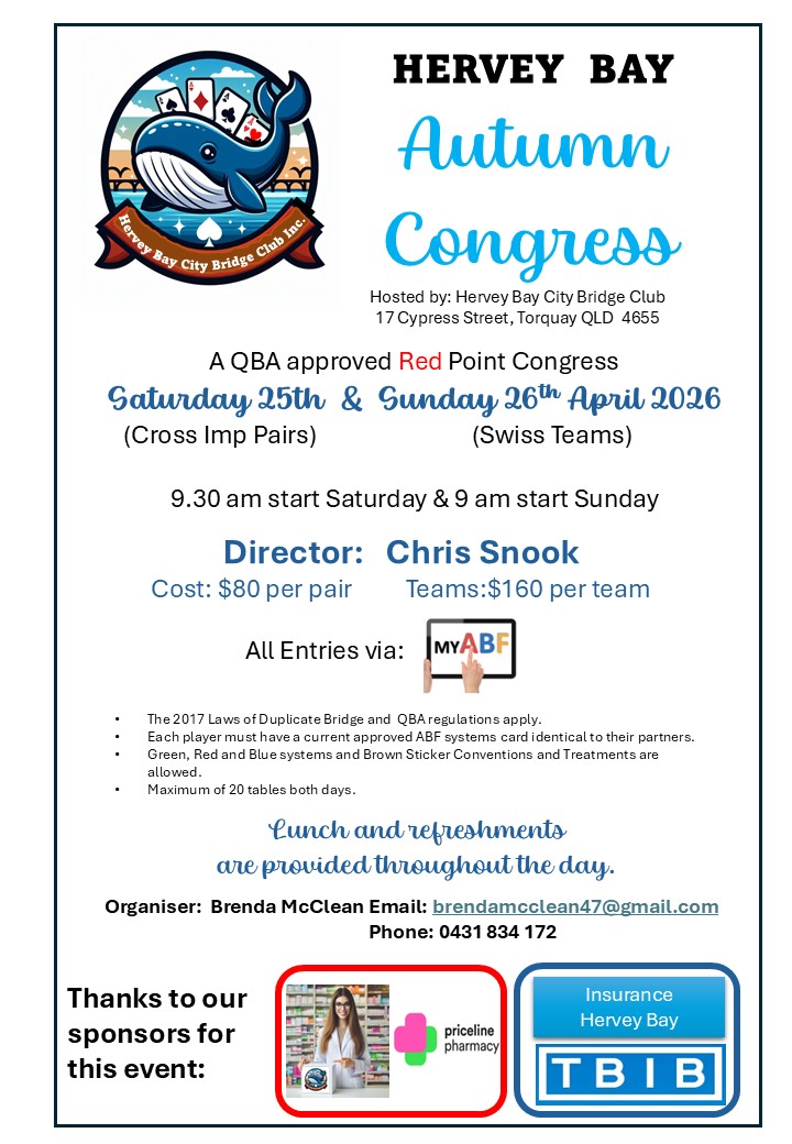 | Hervey Bay Autumn 2026 X-Imp Pairs | 40 credits | Saturday | 25-04-2026 - 9:30am | 33 | Enter View Entries |