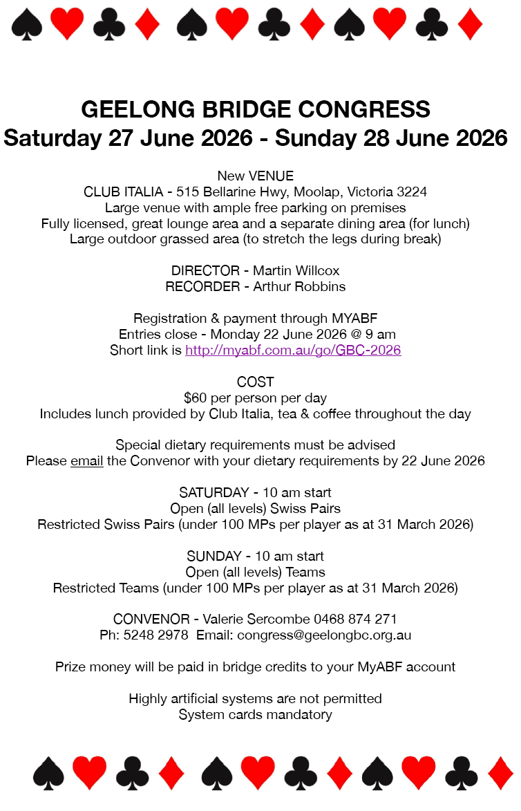 All entries must be paid with bridge credits. For assistance or enquiries please contact convenor or membership@geelongbc.org.au