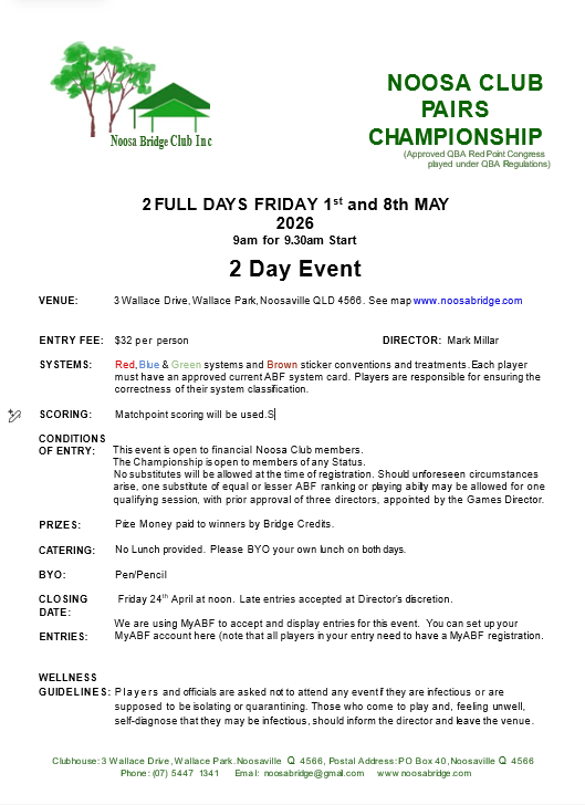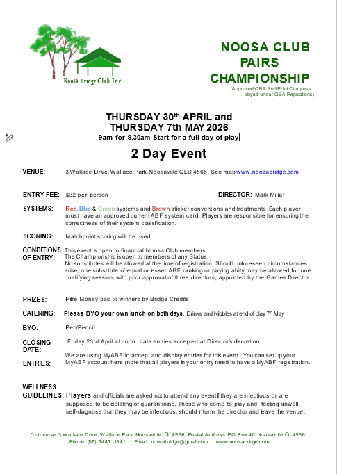 Note: Entry is restricted to members of Noosa Bridge Club Inc.