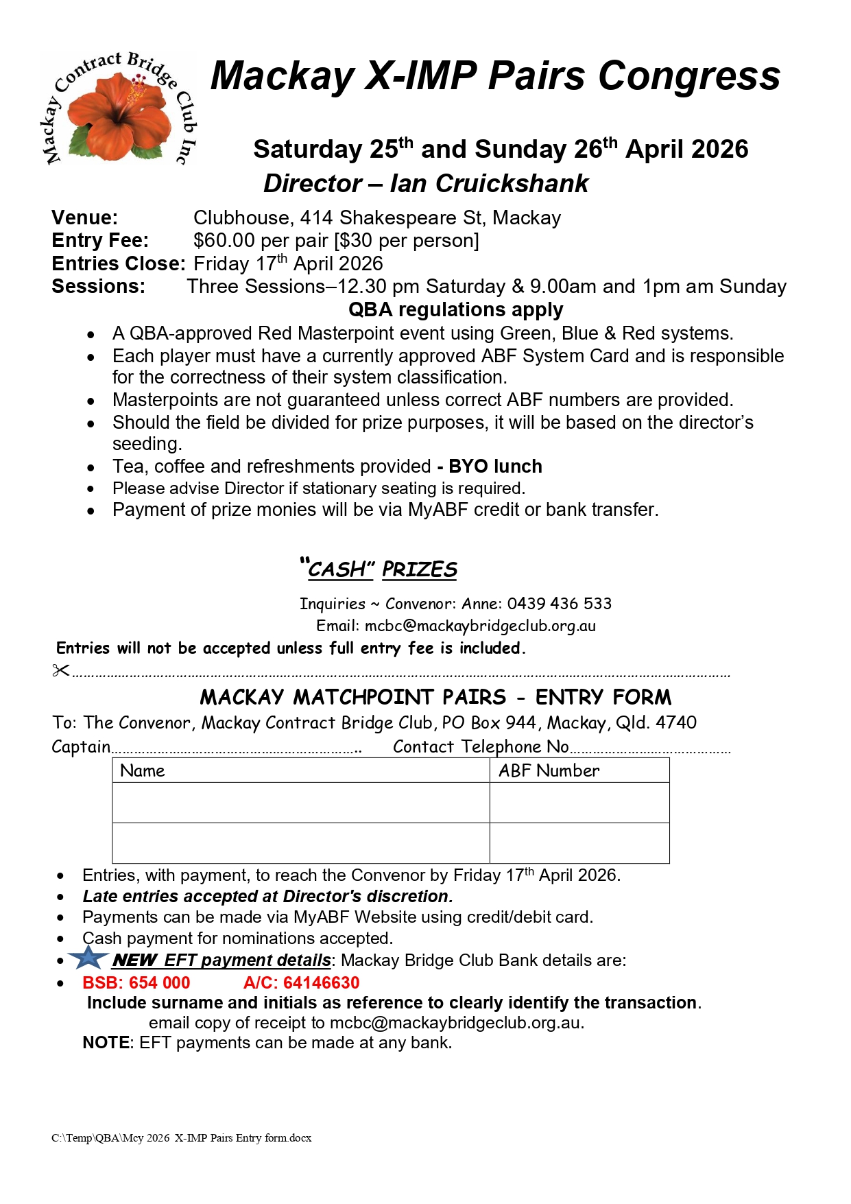 | Mackay X Imp Pairs 2026 | 30 credits | Saturday | 25-04-2026 - 12:30pm | 2 | Enter View Entries |