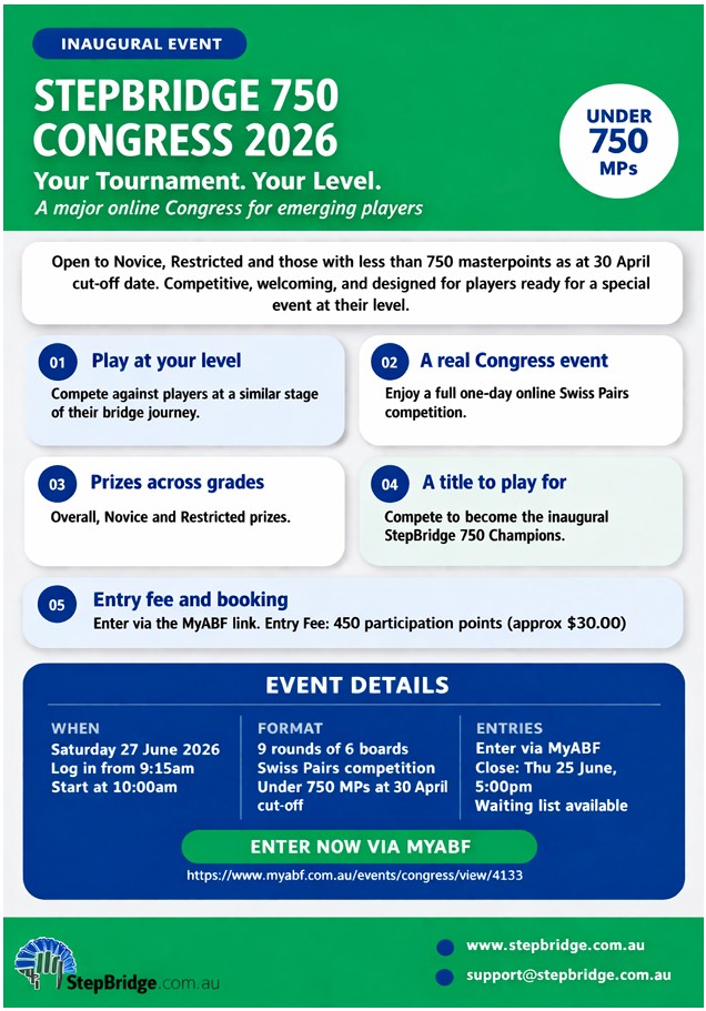 All players must have fewer than 750 Masterpoints as at 30 April 2026.