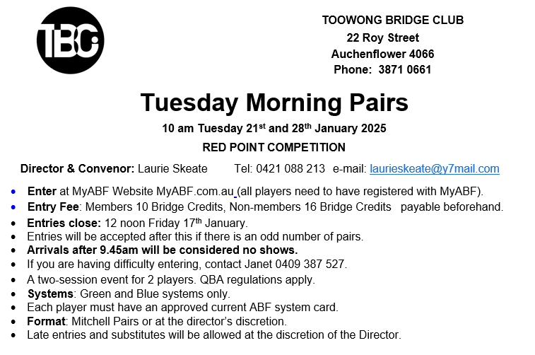| Tuesday Morning Pairs | 10 credits members 16 credits non-members |