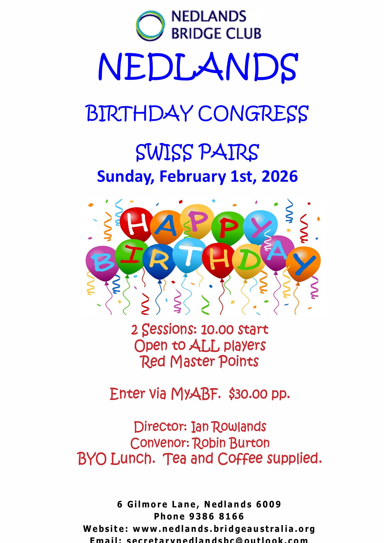 | Swiss Pairs | 30 credits | Sunday | 01-02-2026 - 10am & 1:45pm | 4 | Enter View Entries |