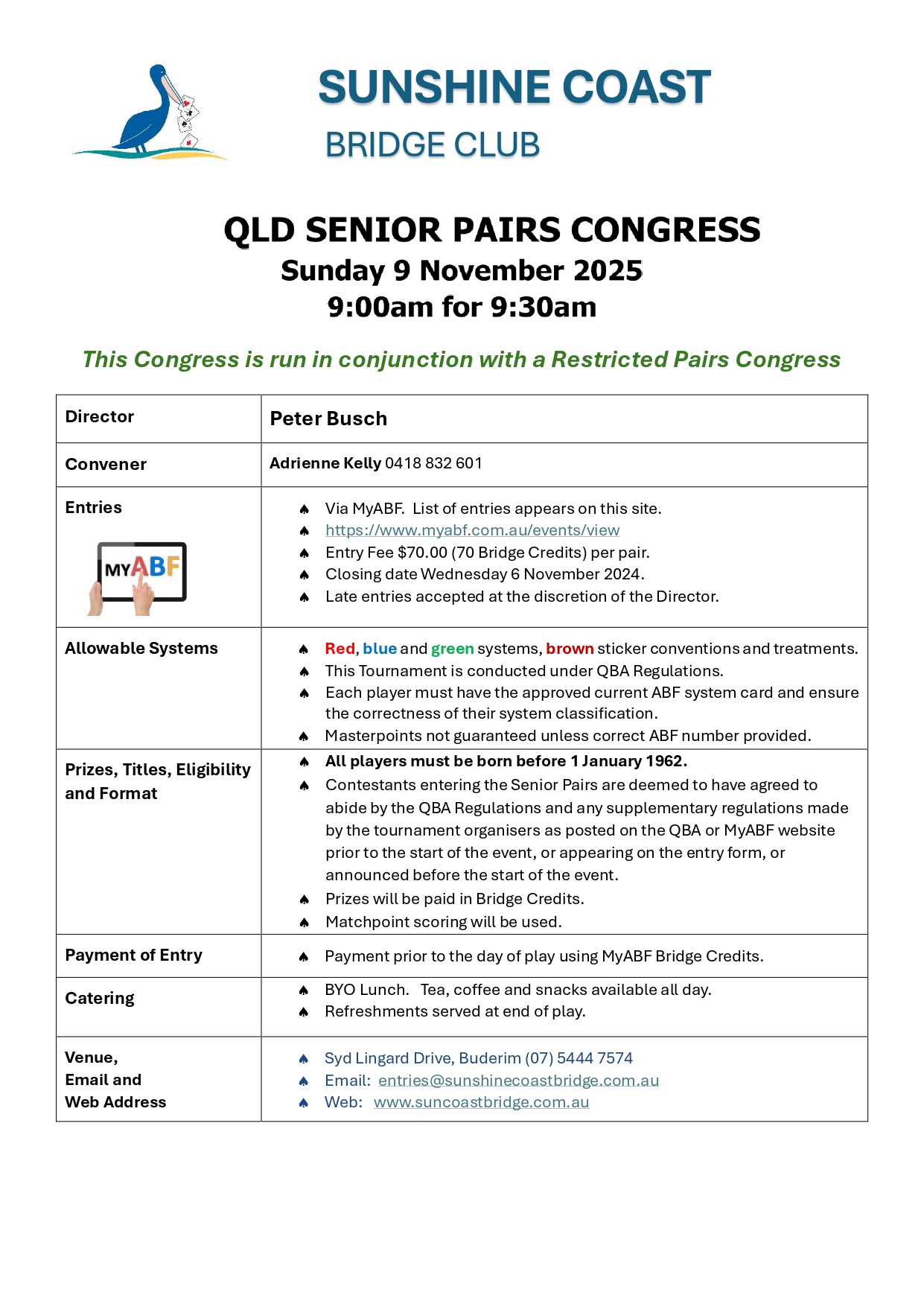 Qld Senior Pairs | 35 credits | Sunday | 09-11-2025 - 9am | 5 | Enter View Entries |
