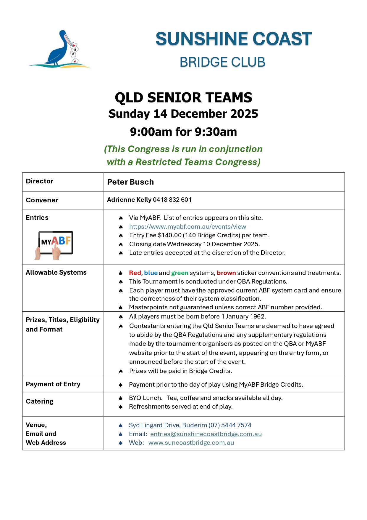 Qld Senior Teams | 35 credits* | Sunday | 14-12-2025 - 9:30am | 5 | Enter View Entries |