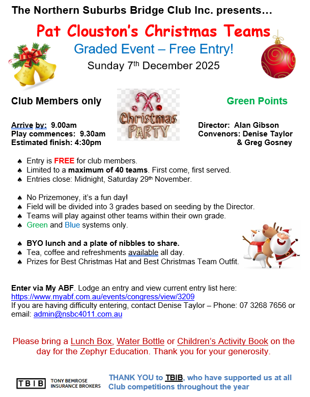 Note: Entry is restricted to members of Northern Suburbs Bridge Club Inc.