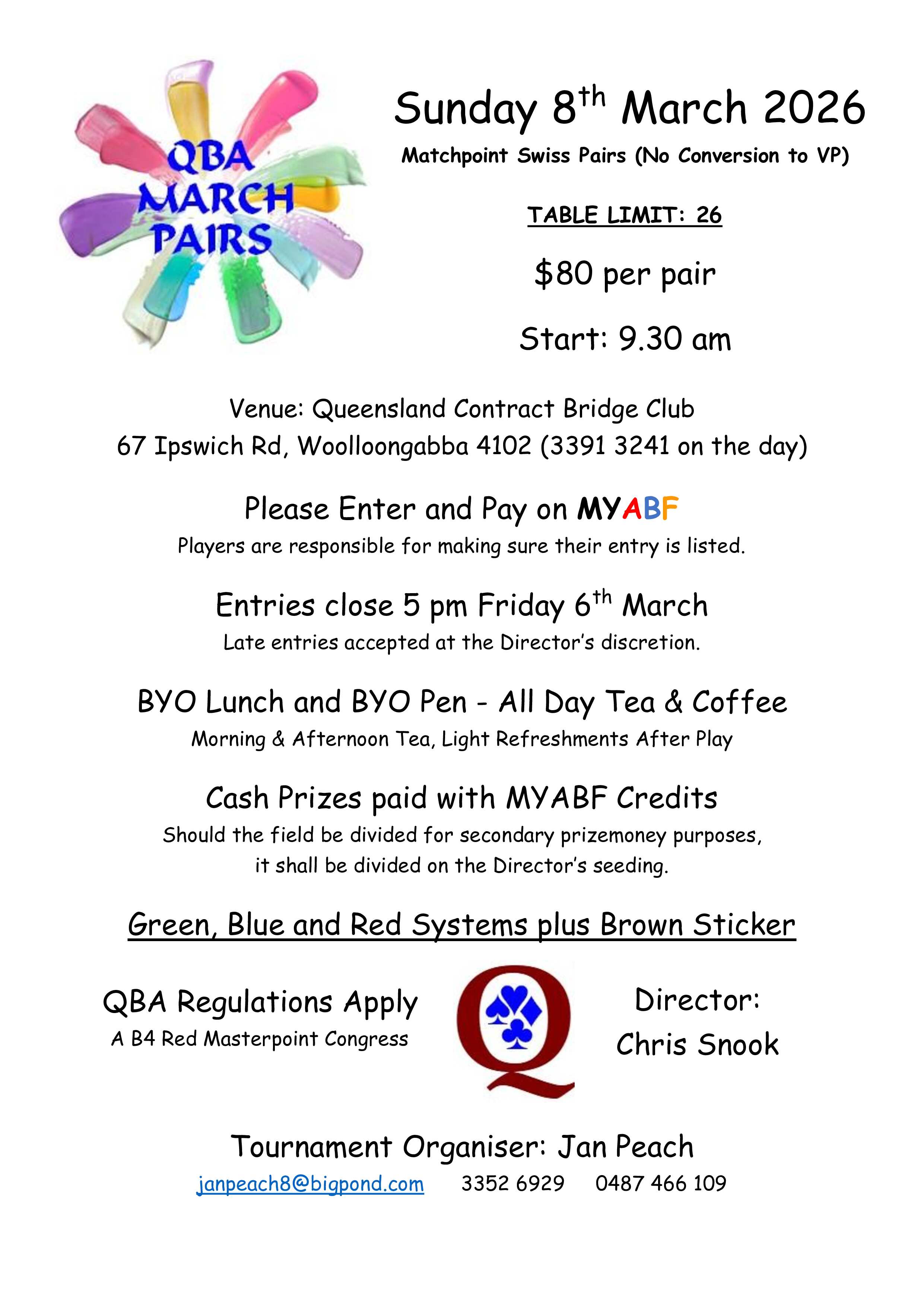 | QBA March Matchpoint Swiss Pairs | 40 credits | Sunday | 08-03-2026 - 9:30am | 14 | Enter View Entries |