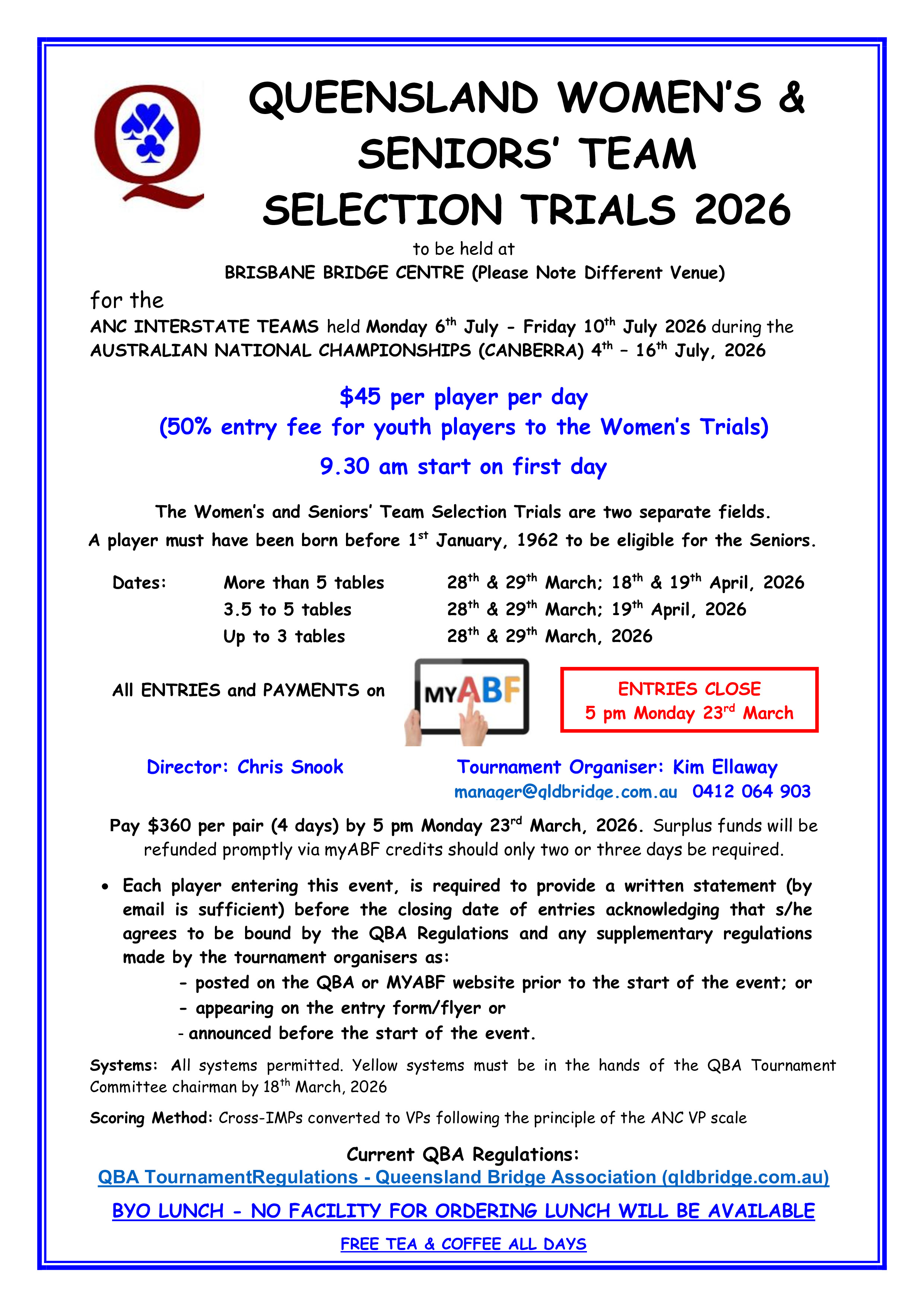 Qld Seniors' Team Selection Trials | 180 credits | Saturday | 28-03-2026 - 9:30am | 0 | Enter View Entries |