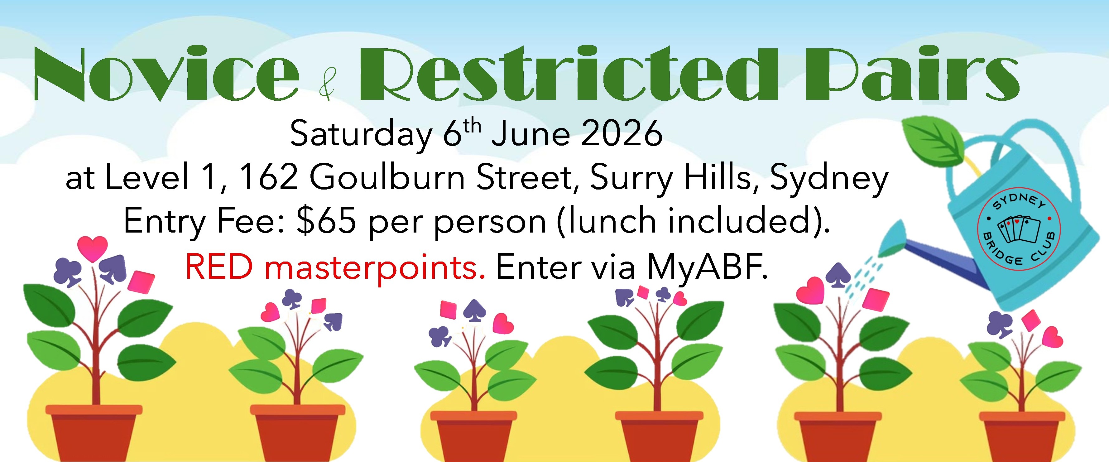Entries are restricted to ONLY Novice and Restricted players. Please sign up in advance via MyABF. Both players in the pair must have fewer than 100 masterpoints / 300 masterpoints as at 1st April 2026 to compete in the Novice / Restricted field.