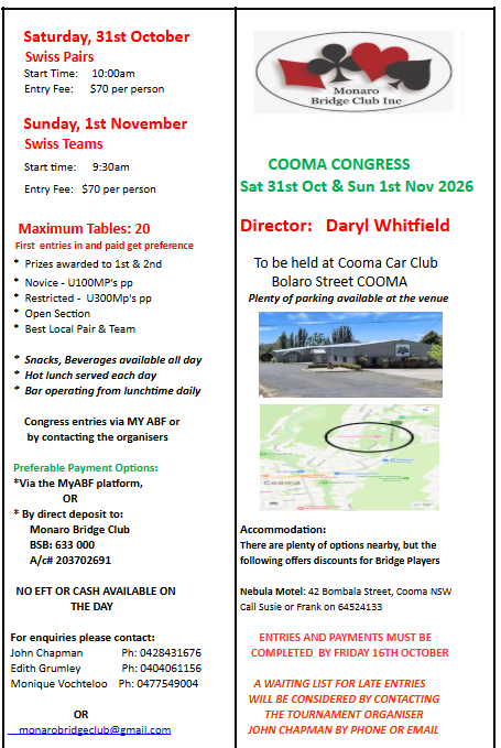 | Pairs | 70 credits | Saturday | 31-10-2026 - 10am | 7 | Enter View Entries |