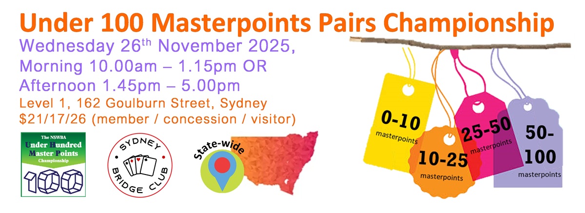Sydney Bridge Club invites you to play in the UNDER 100 MASTERPOINTS PAIRS CHAMPIONSHIP on Wednesday 26th November 2025, your choice of Morning 10.00am - 1.15pm OR Afternoon 1.45pm - 5.00pm, at Level 1, 162 Goulburn Steet, Surry Hills 2010.