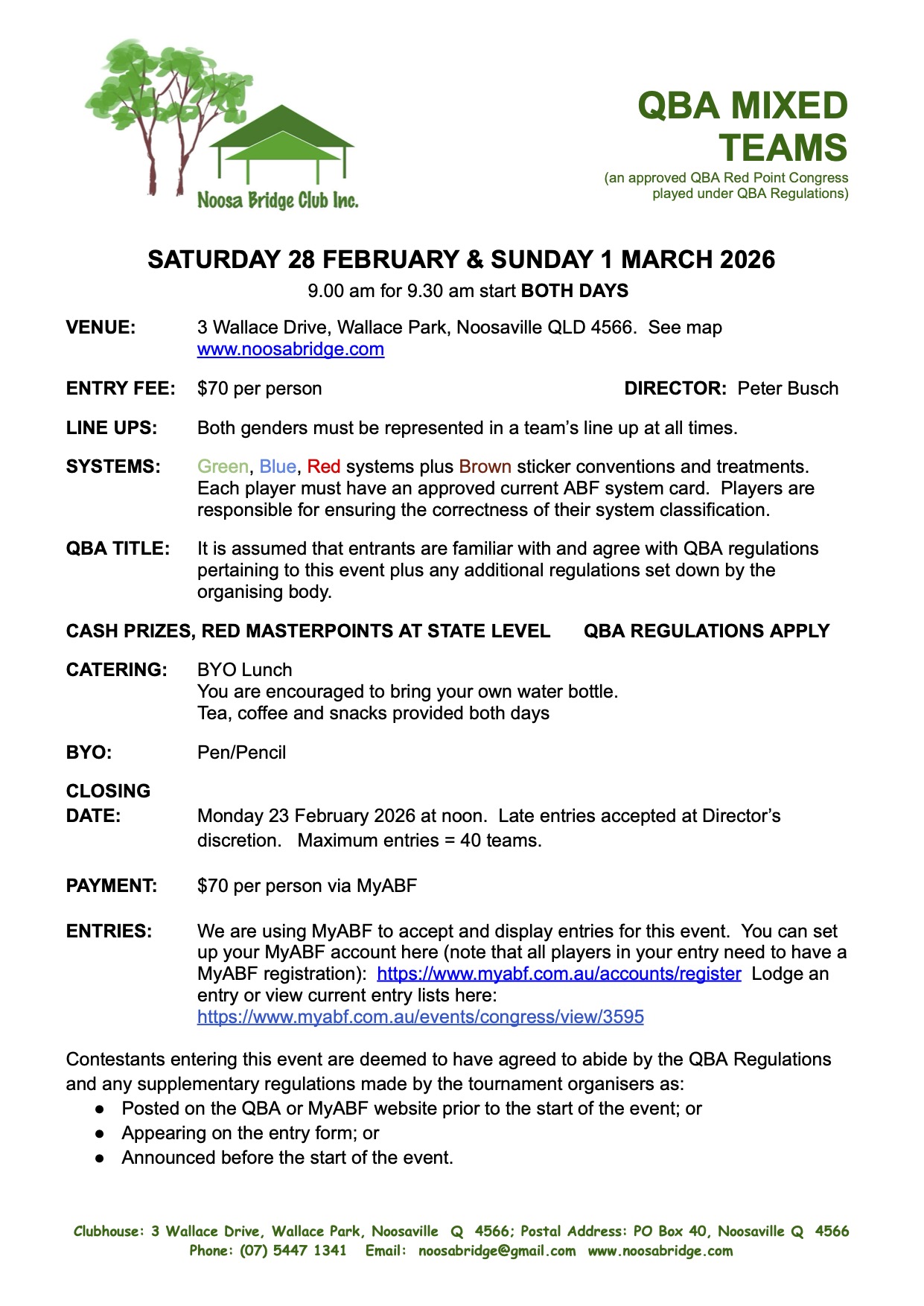 | QBA Mixed Teams | 70 credits* | Saturday | 28-02-2026 - 9:30am | 2 | Enter View Entries |