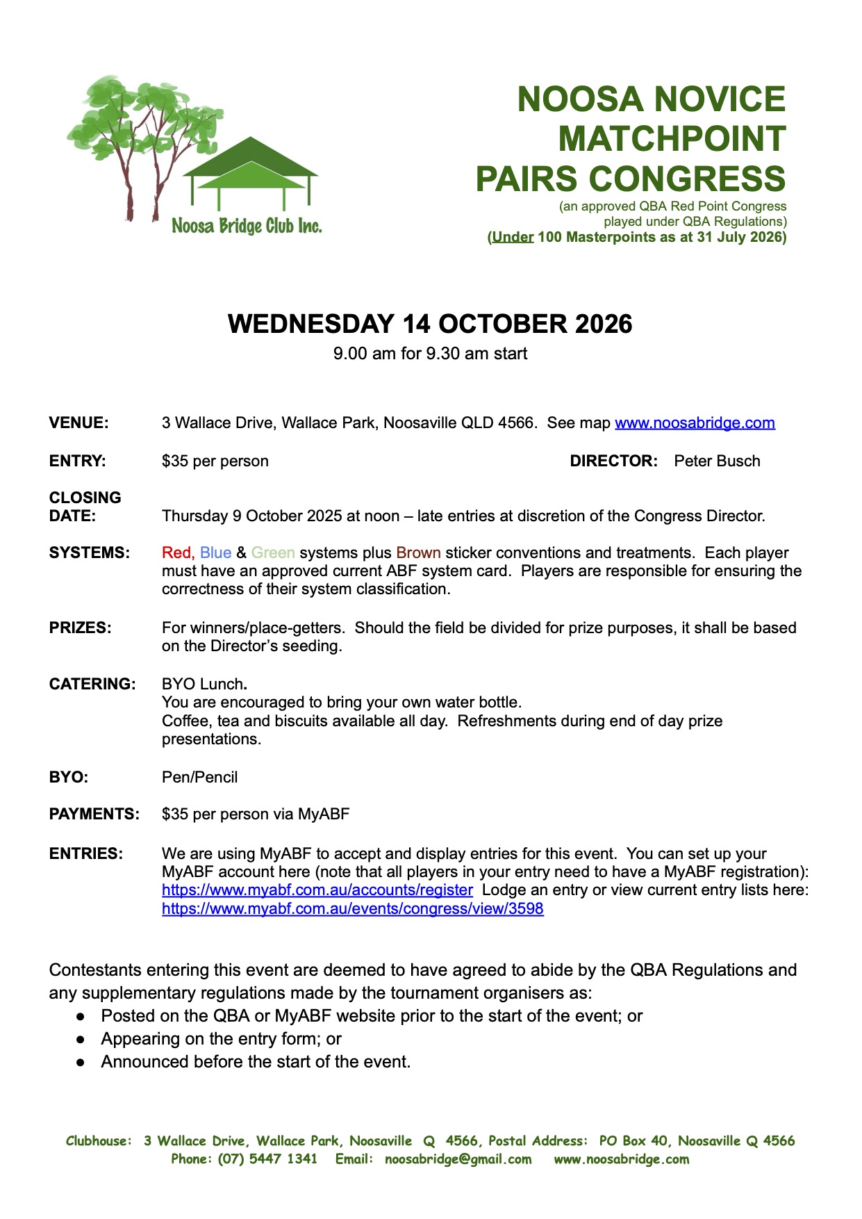 | Noosa Novice Matchpoint Pairs Congress | 40 credits | Thursday | 15-10-2026 - 9:30am | 0 | Entries open in 228 daysView Entries |