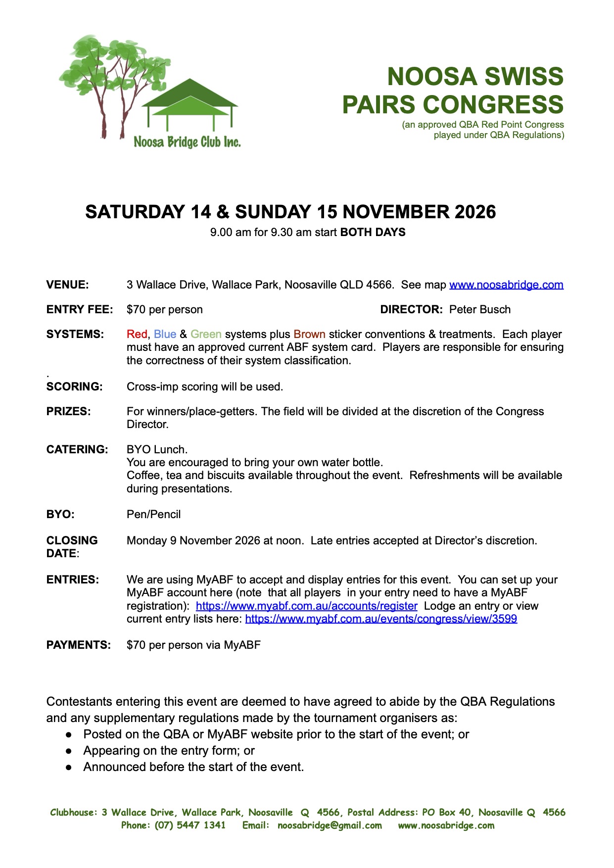 | Noosa Swiss Pairs Congress | 70 credits | Saturday | 14-11-2026 - 9:30am | 0 | Entries open in 267 daysView Entries |