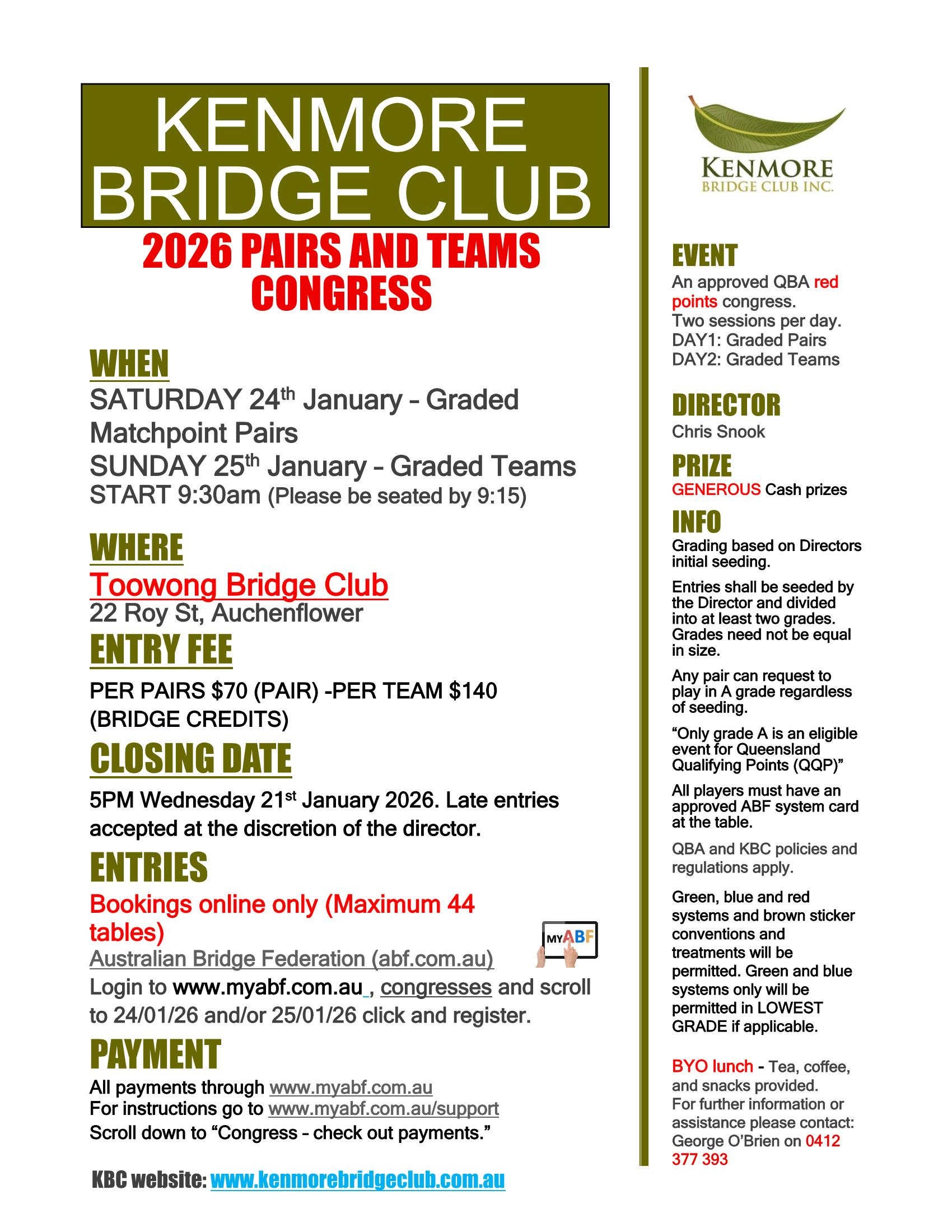 | Graded Matchpoint Pairs | 35 credits | Saturday | 24-01-2026 - 9:30am & 1:30pm | 27 | Enter View Entries |