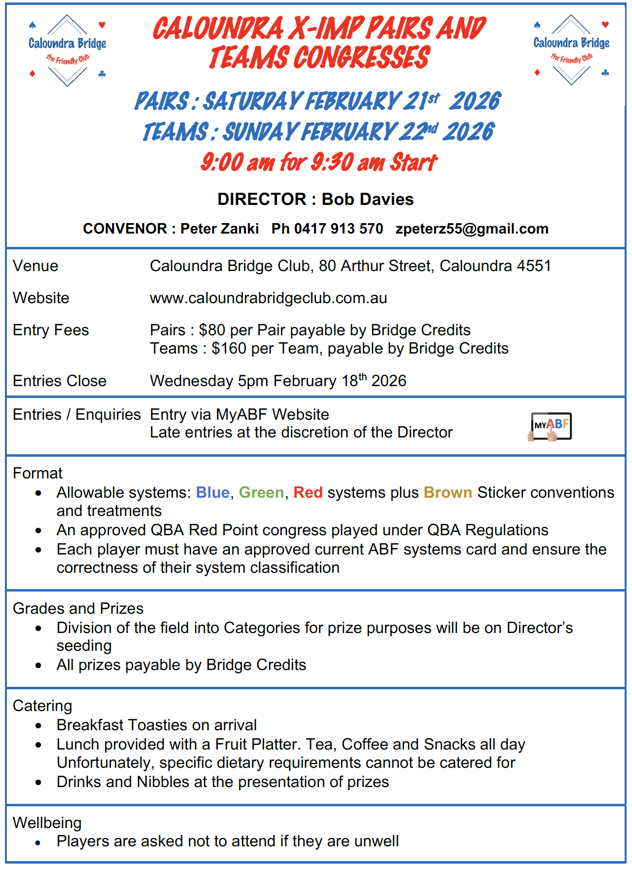 Please advise the Convenor in advance should you require to be stationary for Pairs Congress