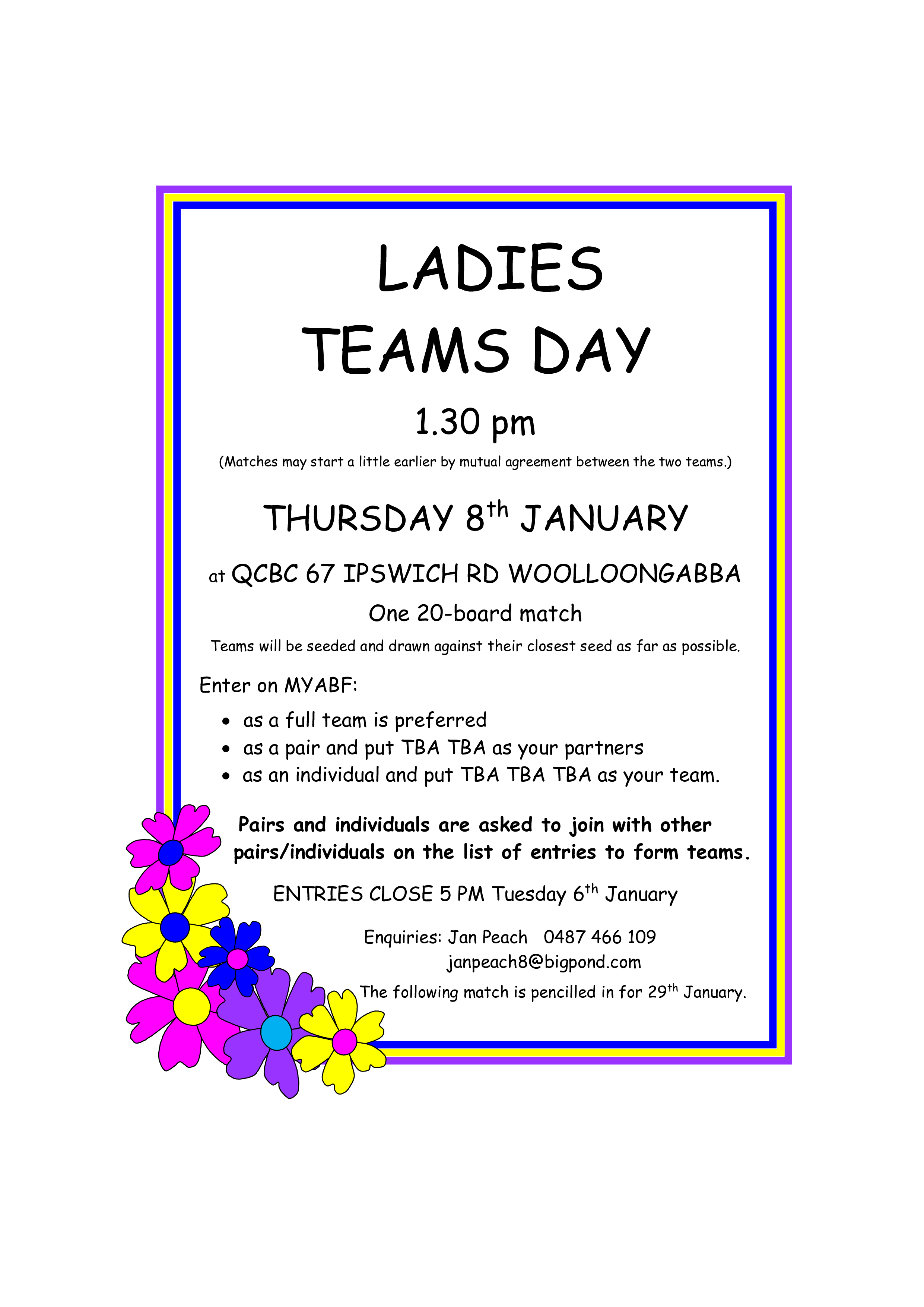 | Ladies Teams | 0 credits | Thursday | 08-01-2026 - 1:30pm | 4 | Enter View Entries |