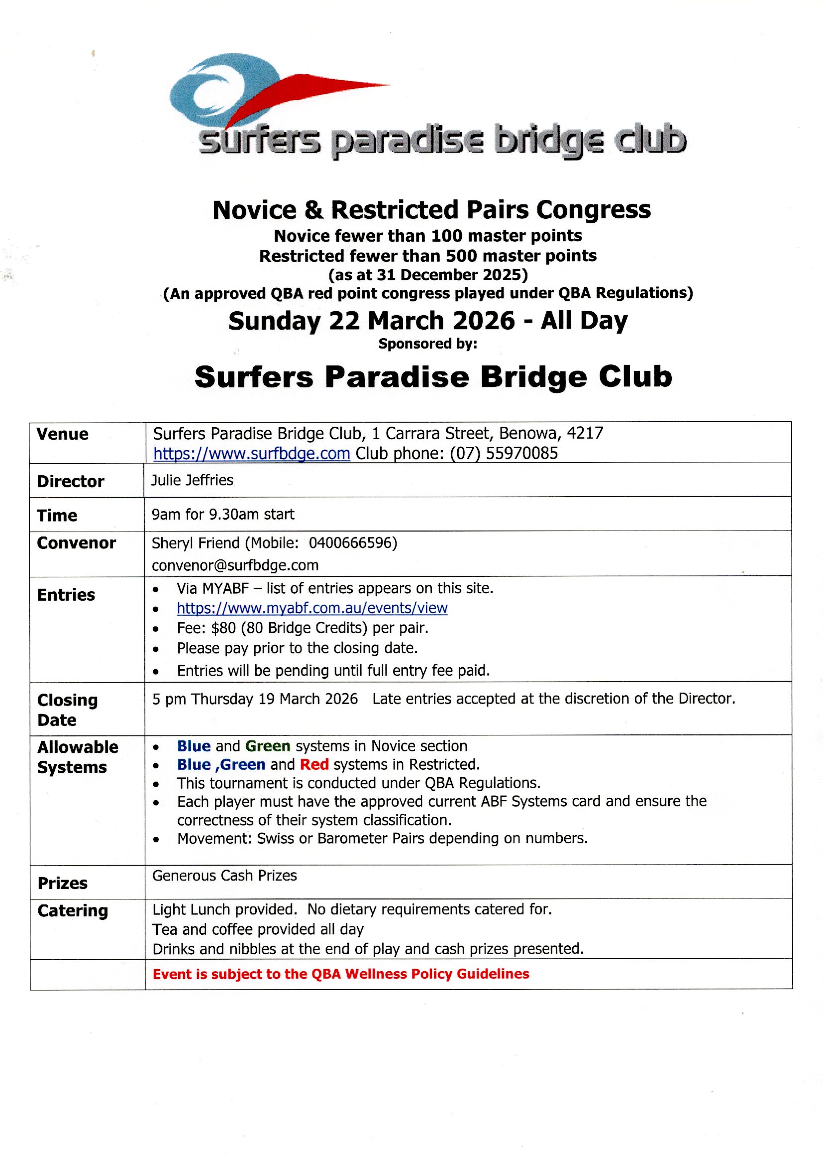 | Restricted Pairs (Under 500 Masterpoints) | 40 credits | Sunday | 22-03-2026 - 9:30am | 0 | Entries open in 21 daysView Entries |