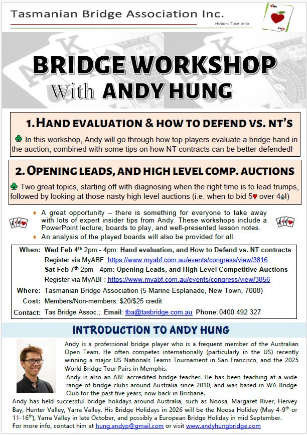 Andy Hung, one of Australia's leading players and teachers, will present a workshop at the TBA clubrooms from 2.00 pm to 4.00 pm on Wednesday 4th February. No partner needed.