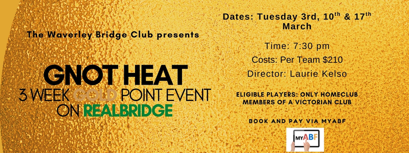 Join us for the Victorian Waverley Bridge Club Qualifier for the Grand National Open Teams (GNOT)! This is your only chance this year to earn gold points at Waverley.
