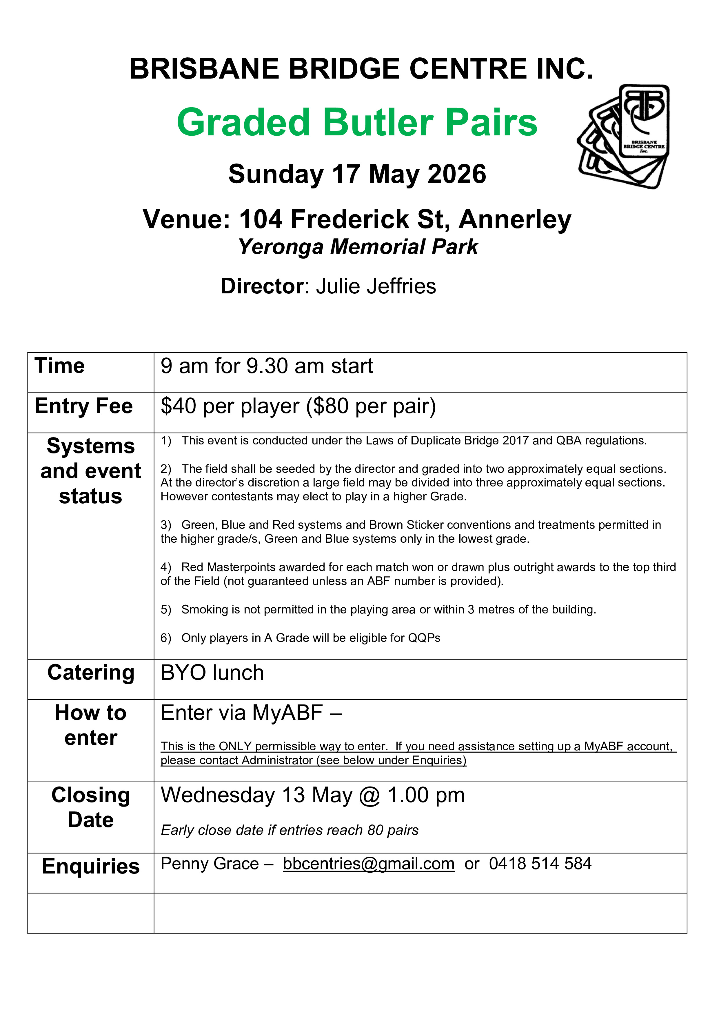 | Graded Butler Pairs | 40 credits | Sunday | 17-05-2026 - 9:30am | 7 | Enter View Entries |