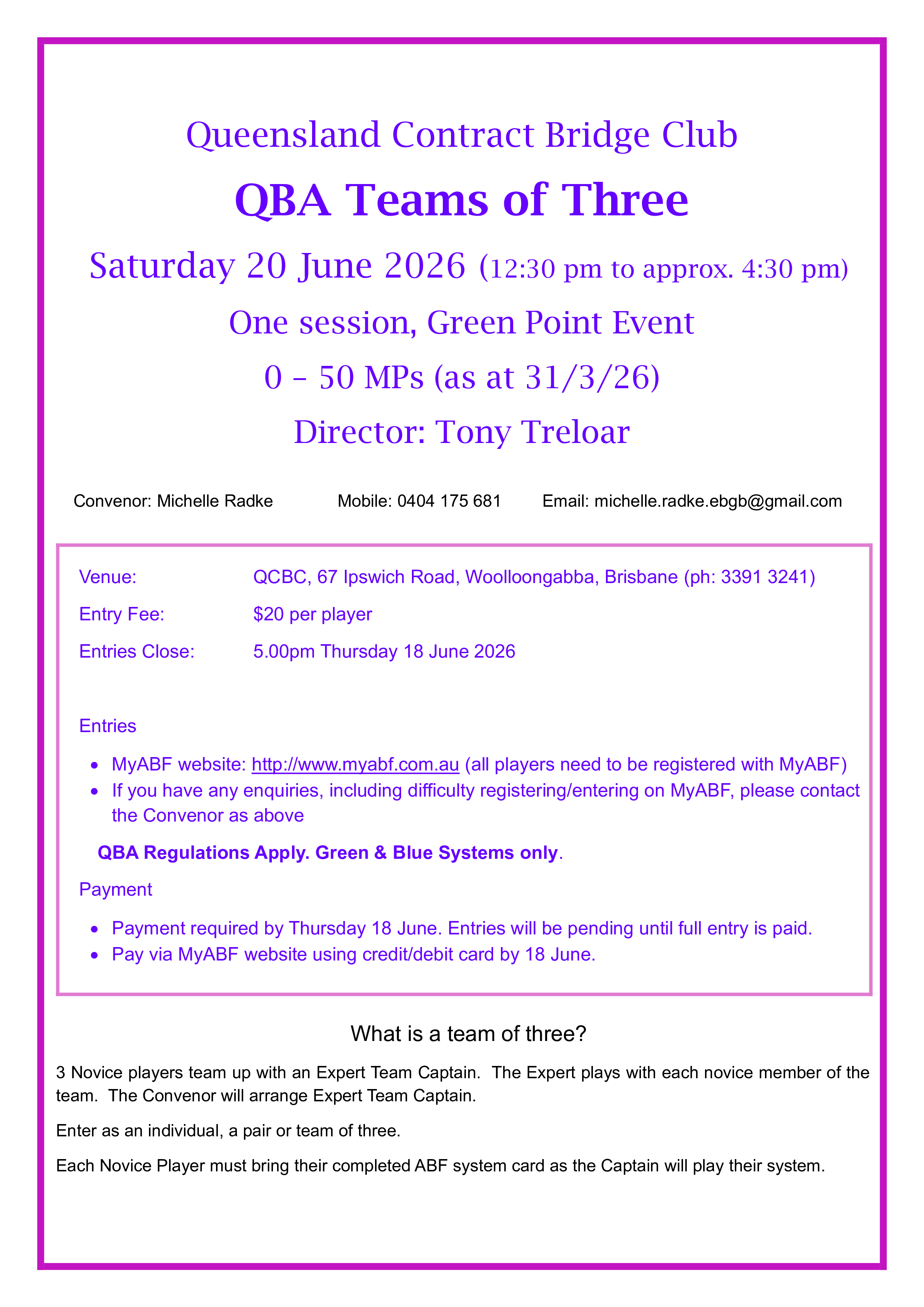 | QBA Teams of 3 - One Session Event | 20 credits | Saturday | 20-06-2026 - 12:30pm | 0 | Enter View Entries |
