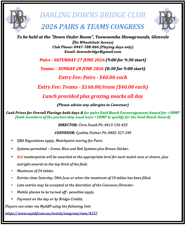 | Pairs | 40 credits | Saturday | 27-06-2026 - 9:30am | 1 | Enter View Entries |